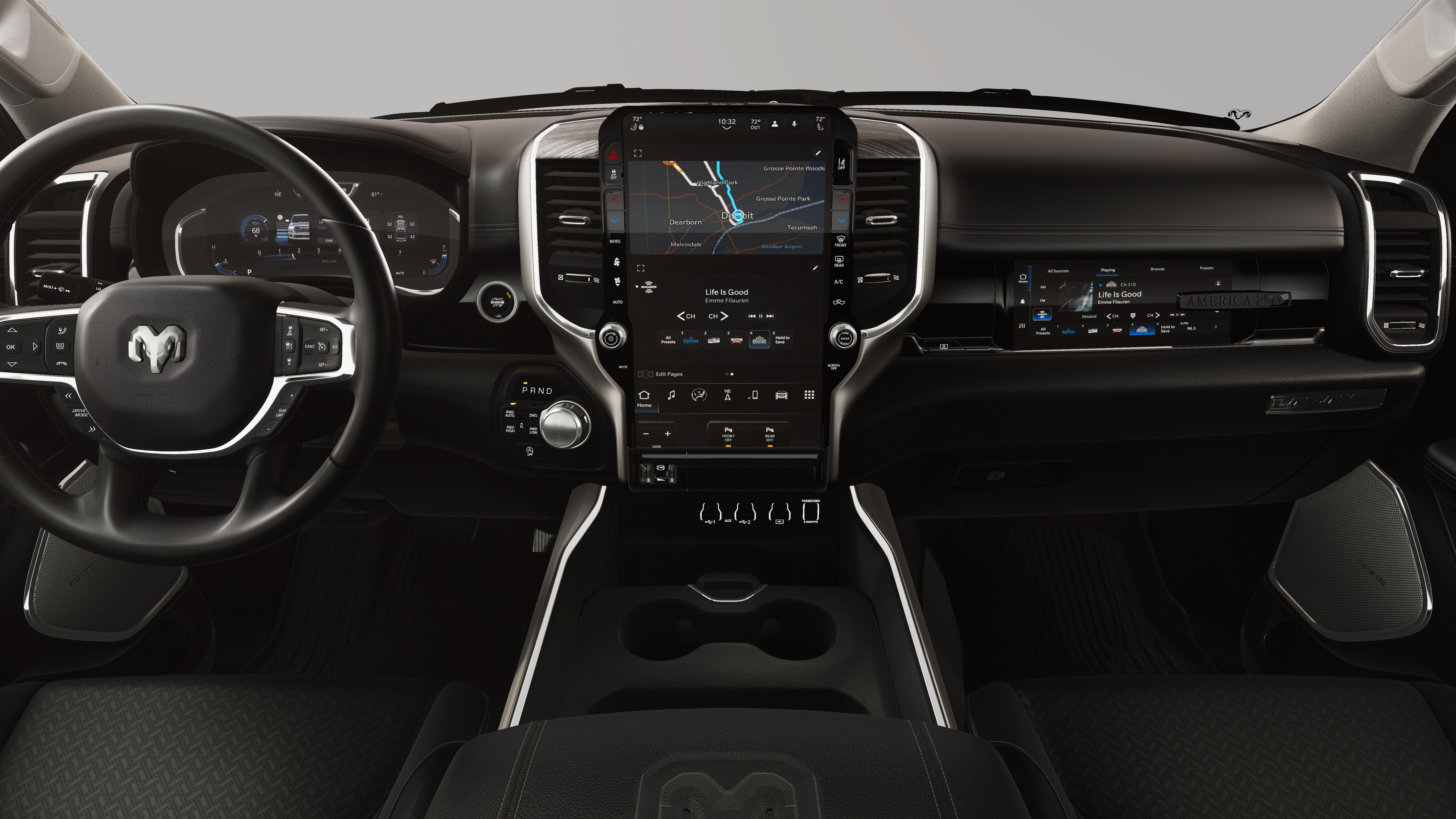Quick Order Package 21H Laramie. Laramie Level 2 Equipment Group: SiriusXM Radio Service; USB Host Flip; Rain Sensitive Windshield Wipers; 14.4" Touchscreen Display; Integrated Center Stack Radio; Front Passenger Interactive Display; Integrated Voice Command with Bluetooth®; Connectivity - US/Canada; Uconnect 5 Nav with 14.4" Display; GPS Navigation; 4G LTE Wi-Fi Hot Spot; Harman/kardon 19 Speaker Premium Sound; SiriusXM with 360L; Connected Travel and Traffic Services; Cluster 12" TFT Color Display; Power Tailgate. RamBox Cargo Management System. Anti-Spin Differential Rear Axle. 33 Gallon Fuel Tank. Trailer Brake Control. MOPAR Front and Rear Rubber Floor Mats. **Equipment listed is based on original vehicle build and subject to change. Please confirm the accuracy of the included equipment by calling the dealer prior to purchase.**