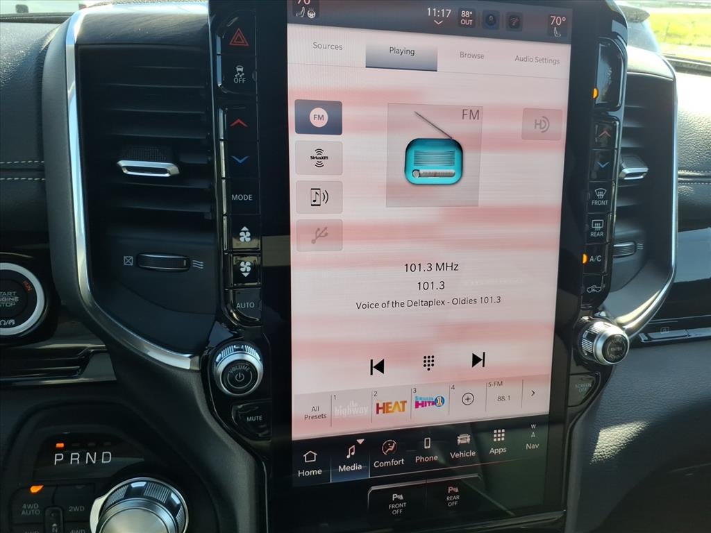 The installed navigation system will keep you on the right path. See what's behind you with the back up camera on this Ram 1500. Bluetooth® technology is built into this model, keeping your hands on the steering wheel and your focus on the road. The leather seats in the vehicle are a must for buyers looking for comfort, durability, and style. It has a premium sound system installed. This 1/2 ton pickup has automated speed control that adjusts to maintain a safe following distance, enhancing highway driving convenience. This unit's Forward Collision Warning system alerts the driver to potential front-end collisions, enhancing safety. This Ram 1500 offers Android Auto for seamless smartphone integration. Apple CarPlay: Seamless smartphone integration for this unit - stay connected and entertained on the go! Start this model from inside with remote start. The vehicle is pure luxury with a heated steering wheel. with XM/Sirus Satellite Radio you are no longer restricted by poor quality local radio stations while driving this model. Anywhere on the planet, you will have hundreds of digital stations to choose from.