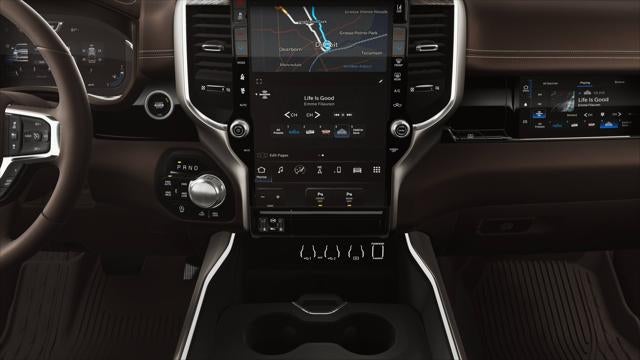 Chrome Appearance Group: Bright Day Light Opening Moldings; Wheel to Wheel Side Steps. Quick Order Package 27H Laramie. Laramie Level 2 Equipment Group: Off-Road Information Pages; SiriusXM Radio Service; USB Host Flip; Rain Sensitive Windshield Wipers; 14.4" Touchscreen Display; Integrated Center Stack Radio; Front Passenger Interactive Display; Integrated Voice Command with Bluetooth®; Connectivity - US/Canada; Uconnect 5 Nav with 14.4" Display; GPS Navigation; 4G LTE Wi-Fi Hot Spot; Harman/kardon 19 Speaker Premium Sound; SiriusXM with 360L; Connected Travel and Traffic Services; Cluster 12" TFT Color Display; Power Tailgate. Off Road Group: Off Road Decals; Steering Gear Skid Plate; Falken Brand Tires; 275/55R20 BSW All-Terrain Tires; Raised Ride Height; Front Extra Heavy Duty Shock Absorbers; Rear Extra Heavy Duty Shock Absorbers; Full Size Spare Tire; Tow Hooks; E-Locker Rear Axle; Transfer Case Skid Plate; Fuel Tank Skid Plate; Selec-Speed Control. Bed Utility Group: MOPAR Spray in Bedliner; Truck Bed Cargo Divider; MOPAR Deployable Bed Step; MOPAR 4 Adjustable Cargo Tie-Down Hooks; Exterior 115V AC Outlet. RamBox Cargo Management System. Wheel to Wheel Side Steps. E-Locker Rear Axle. Trailer Brake Control. Diamond Black Crystal PC. MyFlexCare Service Plan. MOPAR Front and Rear Rubber Floor Mats. 3.92 Rear Axle Ratio. **Equipment listed is based on original vehicle build and subject to change. Please confirm the accuracy of the included equipment by calling the dealer prior to purchase.**