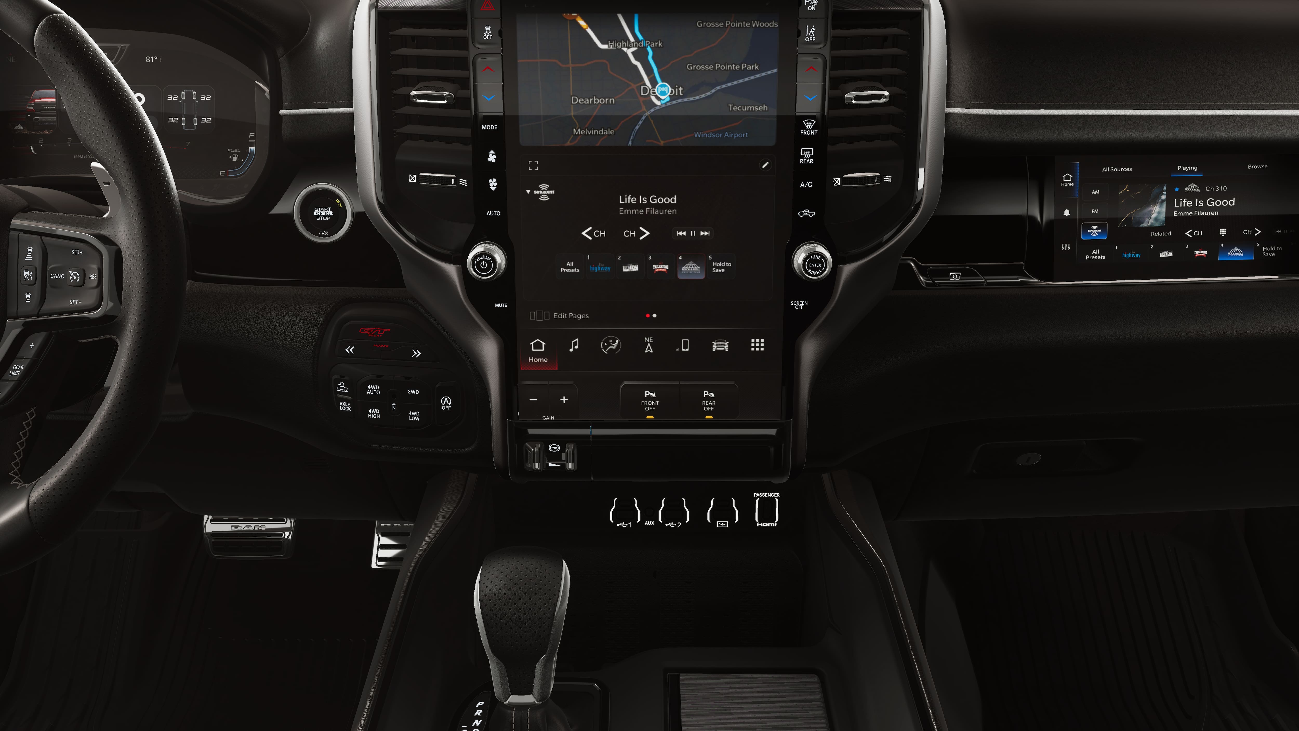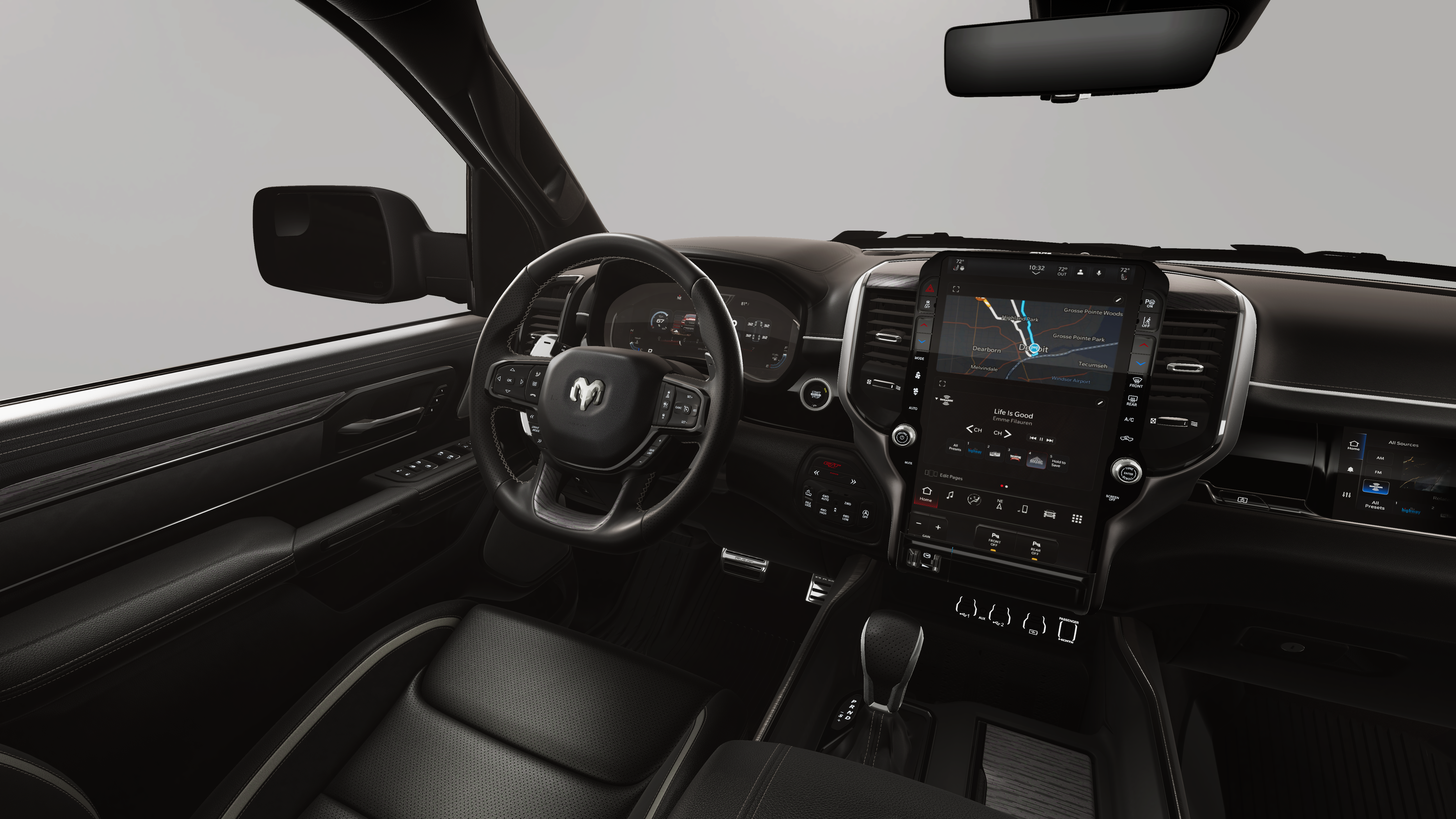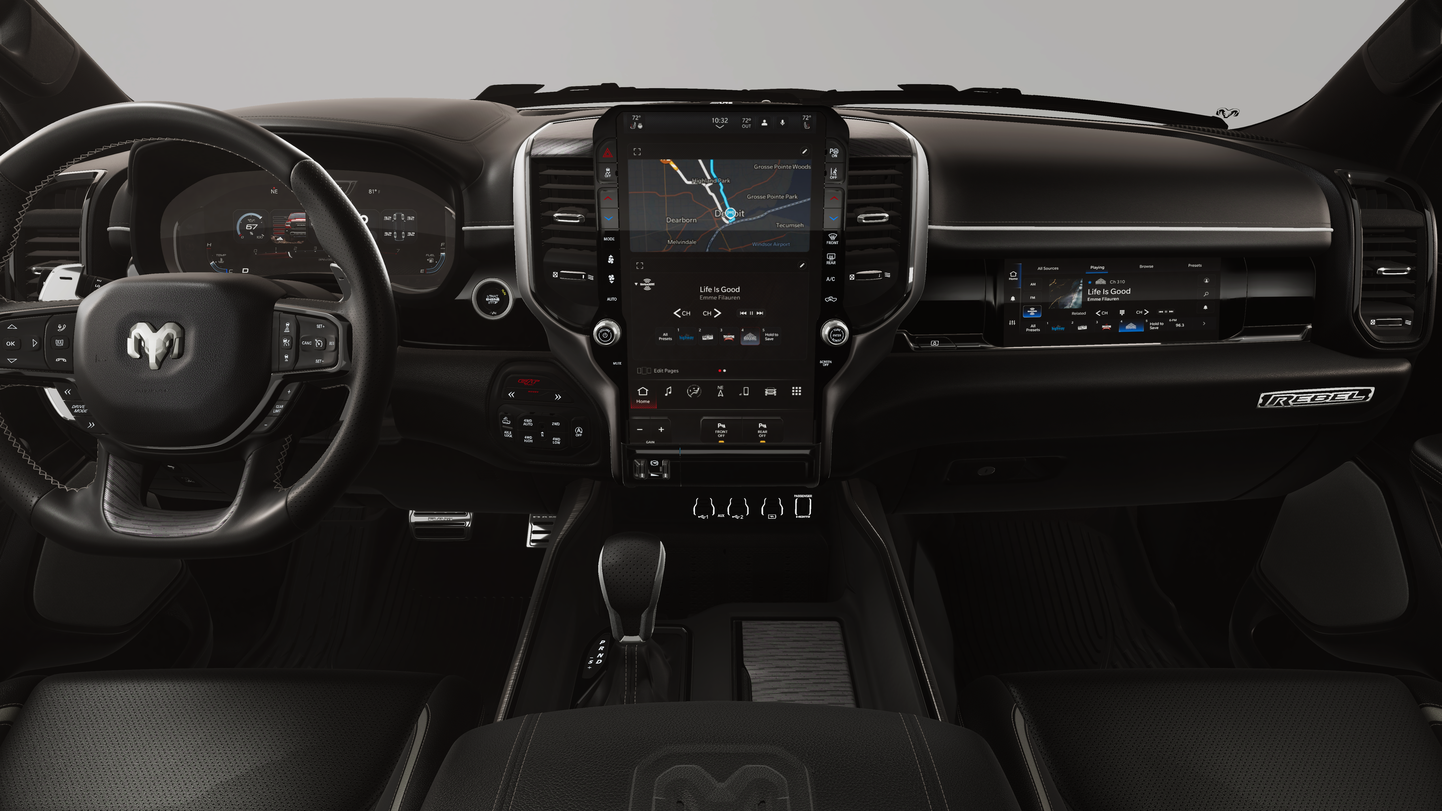 G/T Package: Floor Console; Under Seat Lighting; Leather/vinyl Bucket Seats; G/T Decal; Leather Wrapped Shift Knob; Leather-Wrapped Steering Wheel; Steering Wheel Mounted Shift Control; G/T Exhaust; GT Interior Theme; MOPAR Bright Pedal Kit; Performance Pages. Technology Group: Head Up Display; LED CHMSL Lamp; Digital Rearview Mirror; 12-Way/1-way Trailer Connector. Bed Utility Group: MOPAR Spray in Bedliner; Truck Bed Cargo Divider; MOPAR 4 Adjustable Cargo Tie-Down Hooks; Exterior 115V AC Outlet; MOPAR Deployable Bed Step Center Mount. Quick Order Package 21W Rebel. Rebel Level 2 Equipment Group: Google Android Auto; SiriusXM Radio Service; USB Host Flip; Rear Window Defroster; Rain Sensitive Windshield Wipers; Integrated Center Stack Radio; Power Adjustable Pedals with Memory; Front Passenger Interactive Display; Integrated Voice Command with Bluetooth®; Connectivity - US/Canada; Auto Power-Folding Mirrors; GPS Navigation; 4G LTE Wi-Fi Hot Spot; 115V Auxiliary Rear Power Outlet; GPS Antenna Input; Media Hub with 2 Charge Only USBs; Exterior Mirrors with Heating Element; Proximity Approach/departure Lamps; Auto Dim Exterior Driver Mirror; SiriusXM with 360L; Accent Color Door Handles; Global Telematics Box Module; Connected Travel and Traffic Services; Heated Second Row Seats; Power Adjust 8-Way Front Passenger Seat; Security Alarm; Apple CarPlay; Black Painted Exterior Mirrors Caps; Off-Road Information Pages; Exterior Mirrors Approach Lamps; Disassociated Touchscreen Display; HD Radio; Smartphone as a Key Capable; 14.4" Touchscreen Display; Accent Color Premium Power Mirrors; Dual Wireless Charging Pad; Exterior Mirrors with Supplemental Signals; Exterior Mirrors Courtesy Lamps; Uconnect 5 Nav with 14.4" Display; Harman/kardon 19 Speaker Premium Sound; 2-Door Passive Entry. Front Door Locks; Accent Color Tailgate Handle; Exterior Mirrors with Memory; Driver Seat Memory; Power Tailgate; Convex Wide-Angle Exterior Mirror Insert; Radio/driver Seat/mirrors/pedals Memory. Multi-Function Tailgate. RamBox Cargo Management System. Trailer Brake Control. Diamond Black Crystal PC. **Equipment listed is based on original vehicle build and subject to change. Please confirm the accuracy of the included equipment by calling the dealer prior to purchase.**