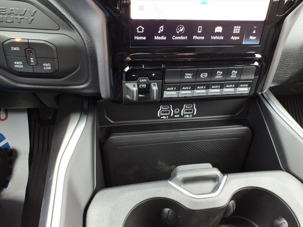 Quick Order Package 24Z Big Horn. Cold Weather Group: Engine Block Heater; MOPAR Winter Front Grille Cover. Big Horn Level 1 Plus Equipment Group: Google Android Auto; SiriusXM Radio Service; For Details Visit DriveUconnect.com; For More Info. Call 800-643-2112; Integrated Voice Command with Bluetooth®; Emergency Vehicle Alert System (EVAS); 12" Touchscreen Display; Glove Box Lamp; Auto Power-Folding Mirrors; Footwell Courtesy Lamp; Mirror Running Lights; MOPAR Deployable Bed Step; Alexa Built-In; Apple CarPlay; Power-Adjustable Convex Aux Mirrors; Forward and Reverse Utility Lights; Locking Lower Glove Box; Remote Start System; 9 Alpine Speakers with Subwoofer; Disassociated Touchscreen Display; Dual Glove Boxes; 2nd Row in Floor Storage Bins; Rear View Auto Dim Mirror; Rear Dome with On/off Switch Lamp; LED Bed Lighting; Connectivity - US/Canada; GPS Navigation; 4G LTE Wi-Fi Hot Spot; GPS Antenna Input; Exterior Mirrors with Heating Element; SiriusXM with 360L; Global Telematics Box Module; Connected Travel and Traffic Services; Foam Bottle Insert (door Trim Panel); Black Exterior Mirrors; Big Horn Instrument Panel Badge; Off-Road Information Pages; Selectable Tire Fill Alert; Trailer Tow Pages; HD Radio; Uconnect 5 Navigation with 12.0" Display Radio; Power Heated Fold Telescopic Mirrors; Exterior Mirrors with Supplemental Signals; Steering Wheel Mounted Audio Controls; Exterior Mirrors Courtesy Lamps; Air Conditioning ATC with Dual Zone Control; MOPAR Spray in Bedliner; Power Adjust Mirrors; Luxury Steering Wheel; Power Telescoping Mirrors. Heated Seats and Wheel Group: Heated Front Seats; Heated Steering Wheel. Dual Rear Wheels: Clearance Lamps; LT235/80R17E BSW All Season Tires; 17" Steel Spare Wheel; Box and Rear Fender Clearance Lamps; Center Hub; 6000# Front Axle with Hub Extension; 17" X 6.0" Polished Aluminum Wheels; Nexen Brand Tires; 14. 000 Lb GVWR; Rear Wheelhouse Liners. Quick Order Package 2UZ Big Horn. Premium Cloth Bucket Seats. 50 Gallon Fuel Tank. Remote Start System. Instrument Panel Mounted Auxiliary Switches. MOPAR Front and Rear Rubber Floor Mats. Rear Wheelhouse Liners. Power 2-Way Driver Lumbar Adjust. Clearance Lamps. **Equipment listed is based on original vehicle build and subject to change. Please confirm the accuracy of the included equipment by calling the dealer prior to purchase.**
