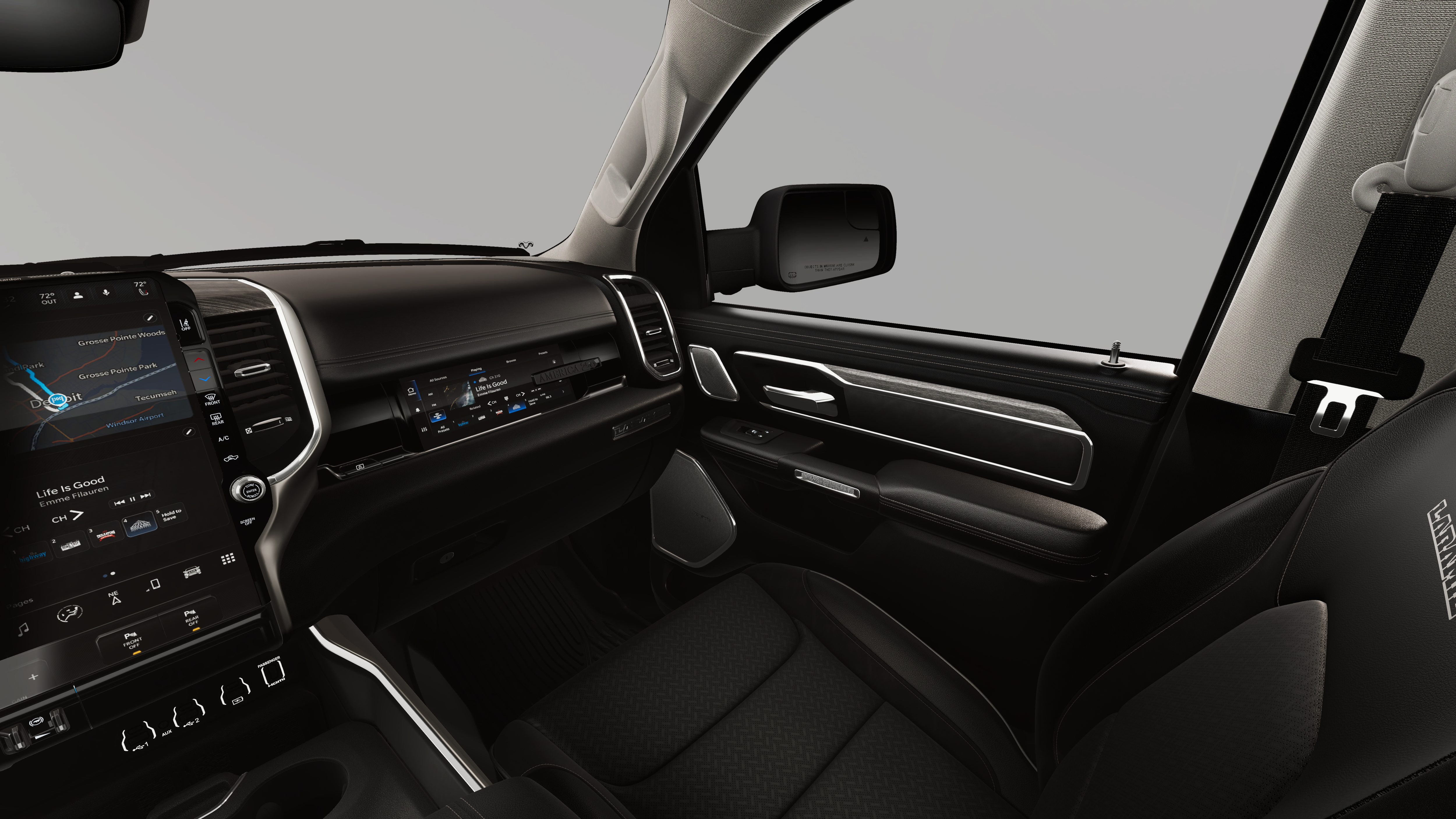 Quick Order Package 21H Laramie. Laramie Level 2 Equipment Group: SiriusXM Radio Service; USB Host Flip; Rain Sensitive Windshield Wipers; 14.4" Touchscreen Display; Integrated Center Stack Radio; Front Passenger Interactive Display; Integrated Voice Command with Bluetooth®; Connectivity - US/Canada; Uconnect 5 Nav with 14.4" Display; GPS Navigation; 4G LTE Wi-Fi Hot Spot; Harman/kardon 19 Speaker Premium Sound; SiriusXM with 360L; Connected Travel and Traffic Services; Cluster 12" TFT Color Display; Power Tailgate. RamBox Cargo Management System. Anti-Spin Differential Rear Axle. 33 Gallon Fuel Tank. Trailer Brake Control. Silver Zynith. MOPAR Front and Rear Rubber Floor Mats. **Equipment listed is based on original vehicle build and subject to change. Please confirm the accuracy of the included equipment by calling the dealer prior to purchase.**